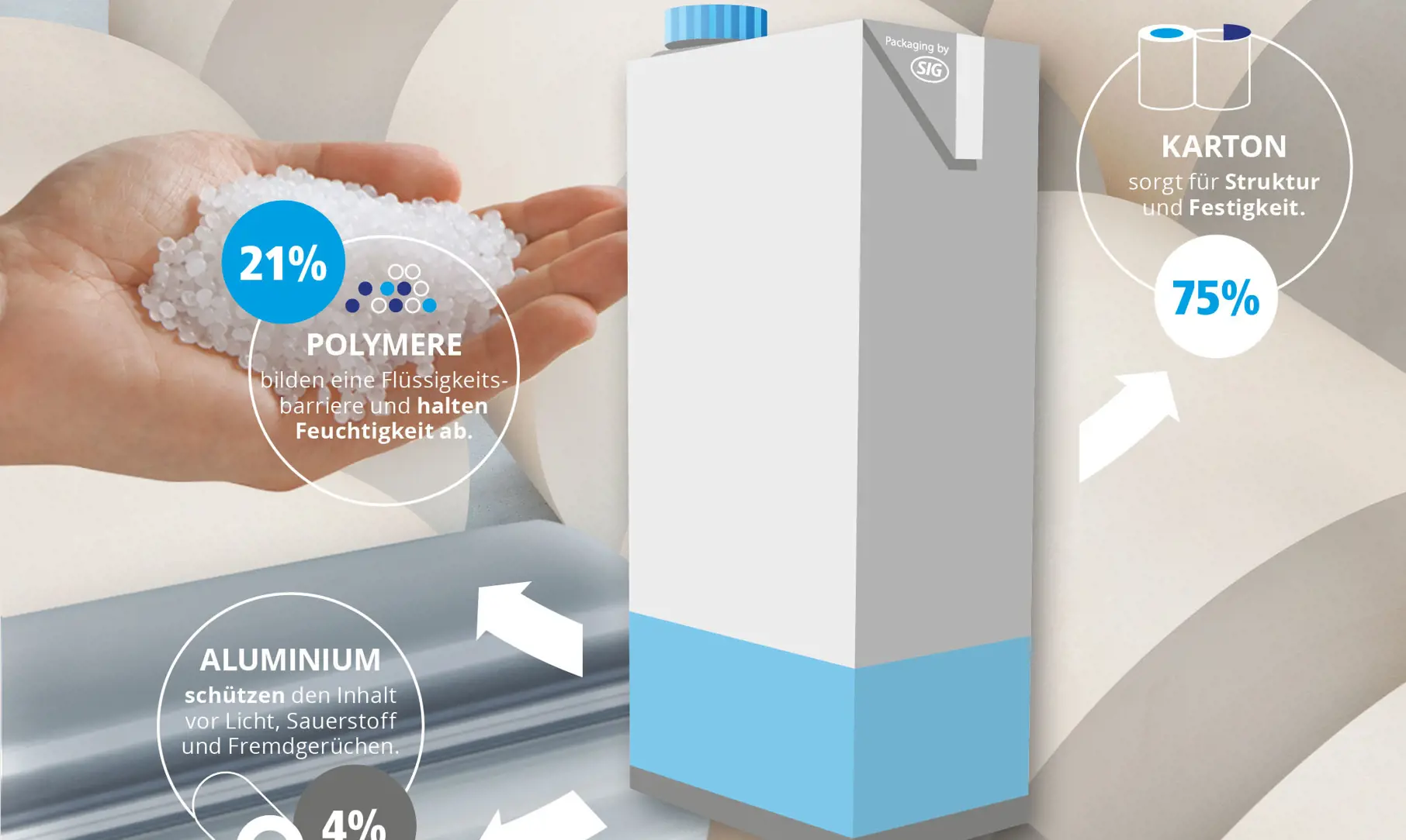 Die meisten Kartonpackungen von SIG bestehen durchschnittlich aus rund 75 % Karton, 21 % Polymeren und 4 % Aluminium. Das Unternehmen hat sich im Rahmen seines Nachhaltigkeitsansatzes WAY BEYOND GOOD verpflichtet, bis 100 % aller Direktmaterialien aus zertifizierten Quellen zu beziehen