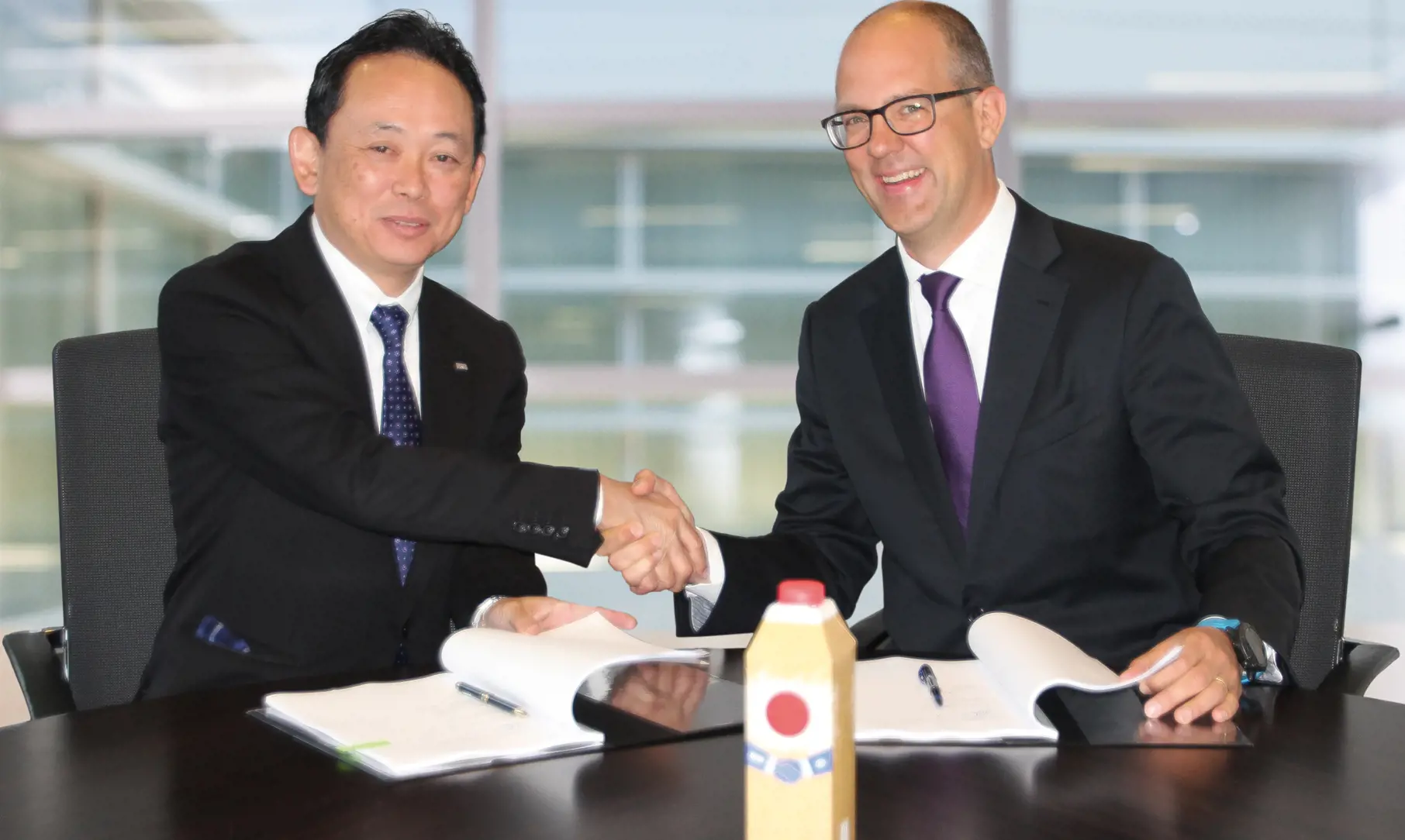 A joint venture has now been signed: Souichiro Nishitani, Corporate Officer and General Manager of Packaging Operations at DNP (left), and Rolf Stangl, Chief Executive Officer (CEO) of SIG.
