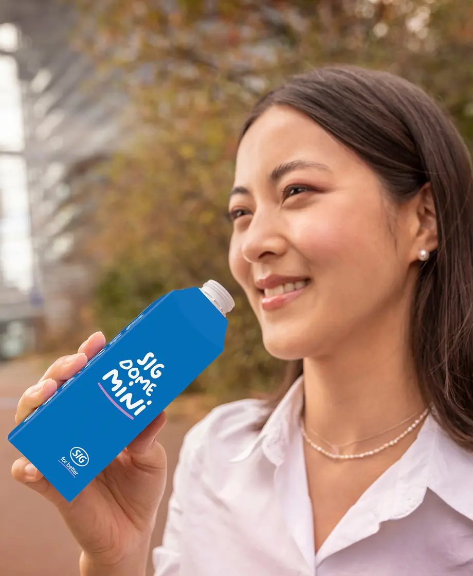 SIG DomeMini offers all the protective and environmental benefits of a differentiated aseptic carton pack, thanks to its shape and central closure position, SIG DomeMini is easy to drink from and convenient to handle – wherever you go.