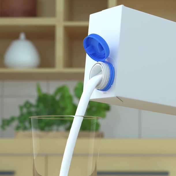 When the pack is opened for pouring, the cap can be firmly fixed at the desired position by pressing it down until it clicks. This means the consumer can pour from the pack without the cap getting in the way and without needing to hold down the cap with their fingers. To close the pack, the cap is simply lifted slightly before closing it the usual way.