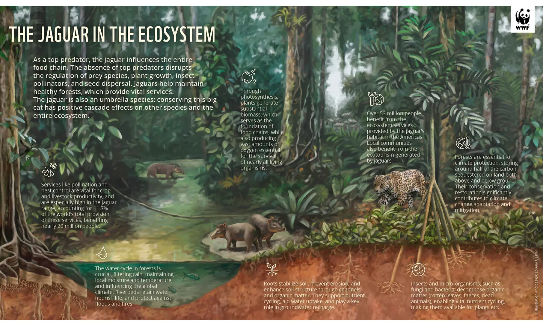 But the good news is that when jaguars and their habitats are healthy, it benefits us all. Over 53 million people benefit from the environmental services –such as clean drinking water, carbon capture, oxygen production, pollination – provided by the forests that jaguars call home.