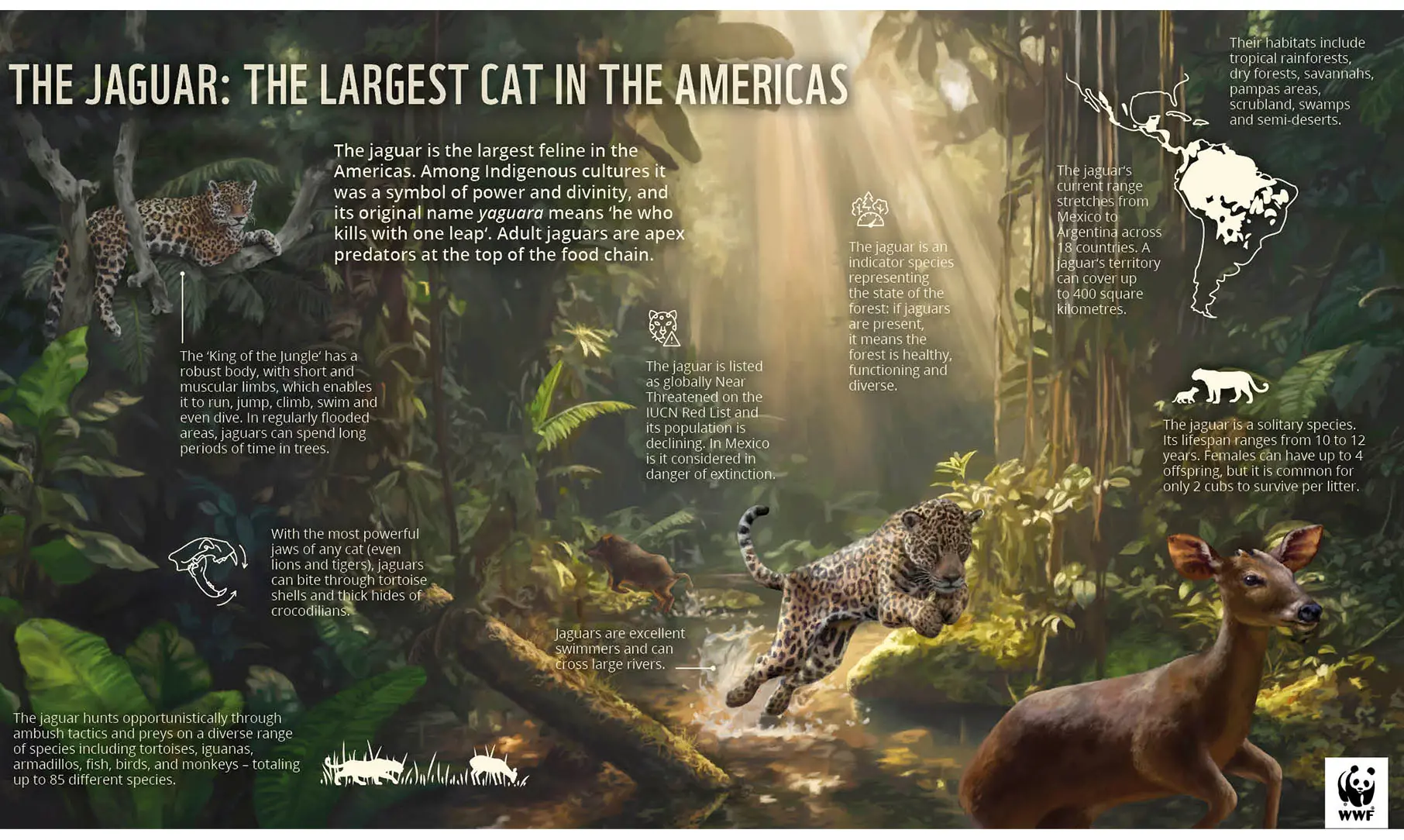 The jaguar’s requirement of a large range, a healthy natural habitat, and an abundance of prey makes them a fantastic example of an umbrella species. To conservationists including WWF, this means that jaguar-focused conservation also helps protect all the other species in the same ecosystem, while benefiting local communities too. Just like an umbrella protects everything underneath it from the rain, the jaguar king can protect its kingdom and all who depend on it.