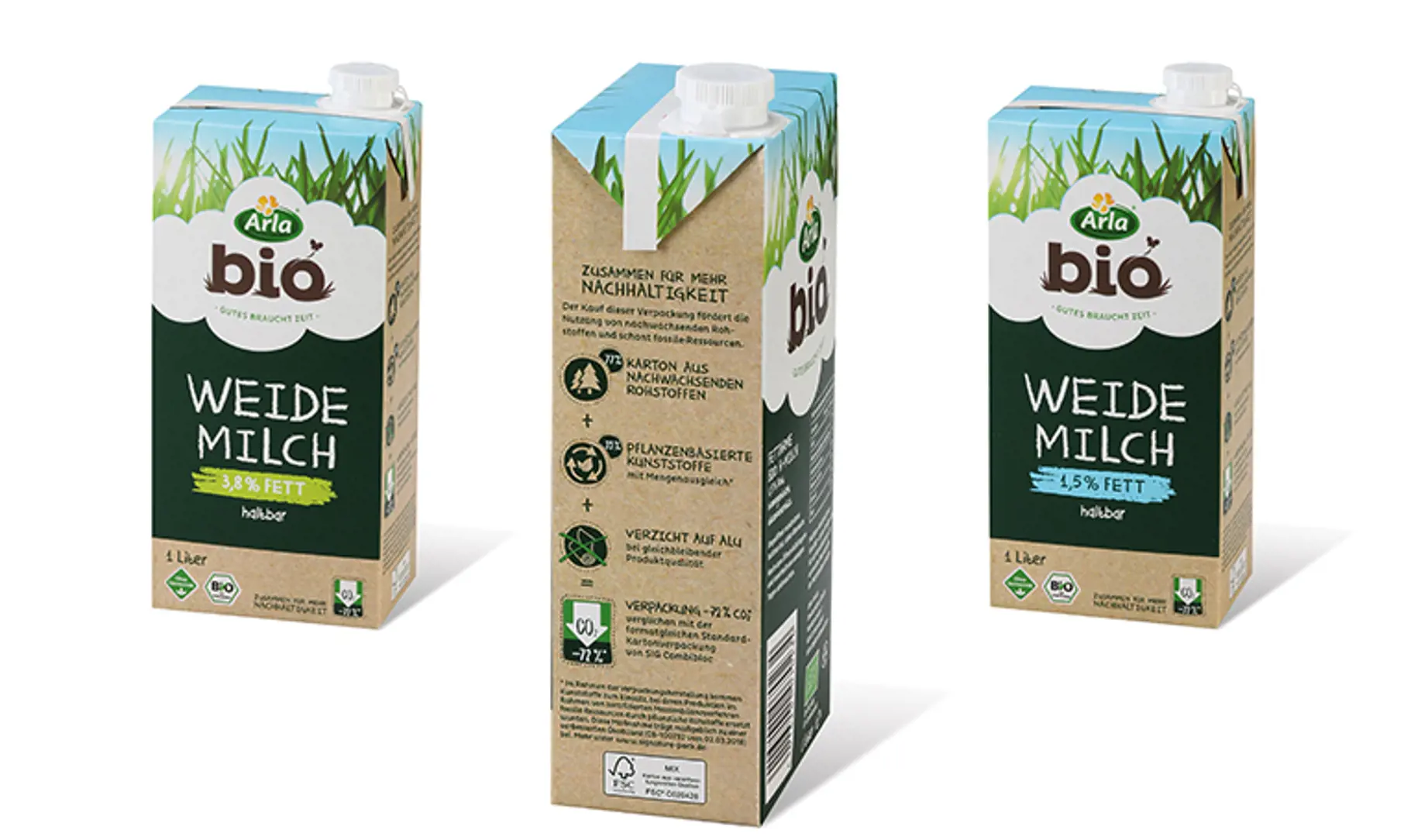 Arla Foods Germany is the first company to opt for the innovative SIGNATURE PACK from SIG – the world’s first aseptic carton pack that is 100% linked to plant-based renewable material. Arla now offers its 1 litre 1.5% and 3.8% organic milk (Arla® BIO Weidemilch) in the SIGNATURE PACK.