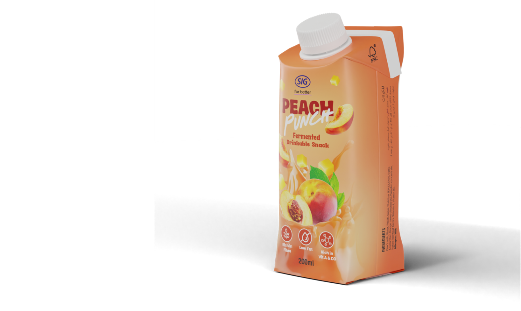Ingredients: Cow's milk, Water, Peach, Sugar, Stabilizer (E1422, E466, E418), Acacia fiber, Orange carrot concentrate, Pumpkin concentrate, Nature identical flavors, Vitamin A, Vitamin D3.