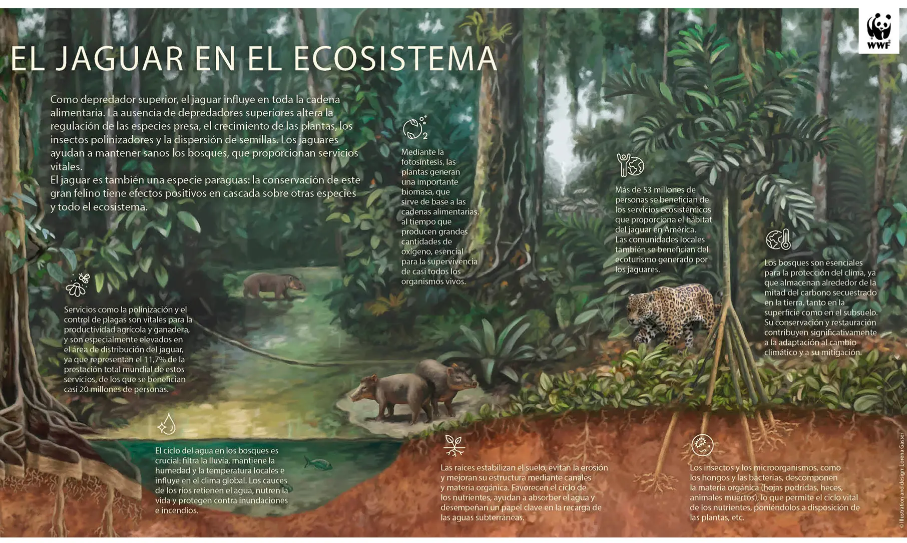 Pero la buena noticia es que cuando los jaguares y sus hábitats están sanos, eso nos beneficia a todos. Más de 53 millones de personas se benefician de los servicios medioambientales -como agua potable, captación de carbono, producción de oxígeno, polinización- que proporcionan los bosques que los jaguares llaman hogar.