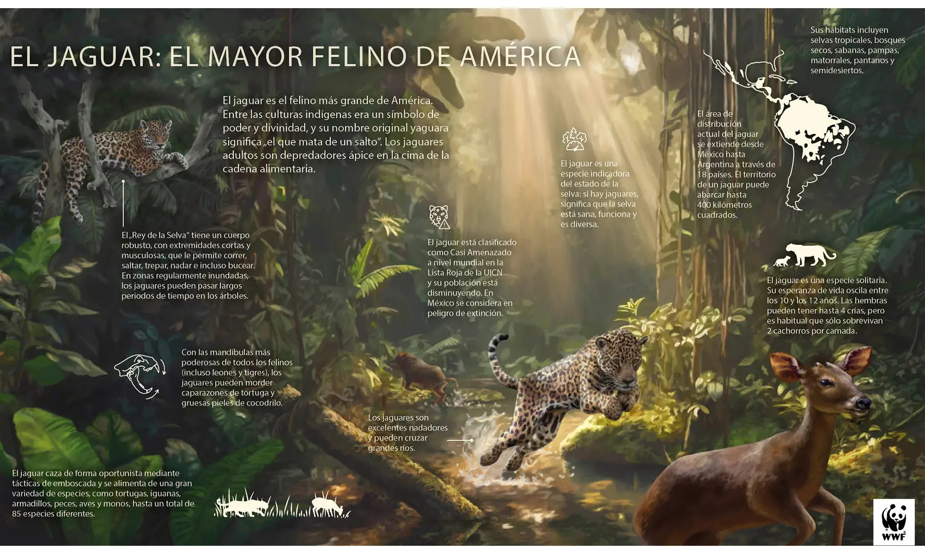 Originario de América y con una distribución que va desde el norte de México hasta el norte de Argentina, el jaguar ha sido un símbolo de poder en la cultura humana durante siglos. Su nombre procede de yaguar, palabra tupí-guaraní que significa "el que mata de un salto". Con un rugido como el trueno, el color del sol ardiente y manchas como la luna, se entiende por qué el jaguar es venerado como un rey. Pero un rey no puede gobernar sólo con la fuerza y el miedo; un rey también debe proteger.
