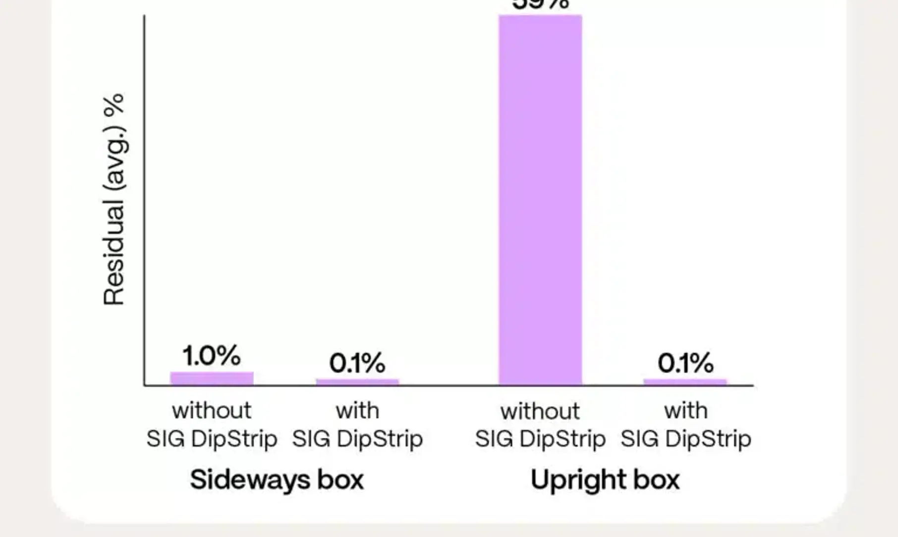 What we found exceeded our expectations. The packages with a SIG DipStrip, on average, left 0.11% or less of product in their packaging (0.079% for packaging left sideways and 0.102% for packaging left upright), and every single set within each category that had a SIG DipStrip fell below the .3%—there were no outliers or failures within either group that had a SIG DipStrip. That’s great because all our testing packages met our target percentage.