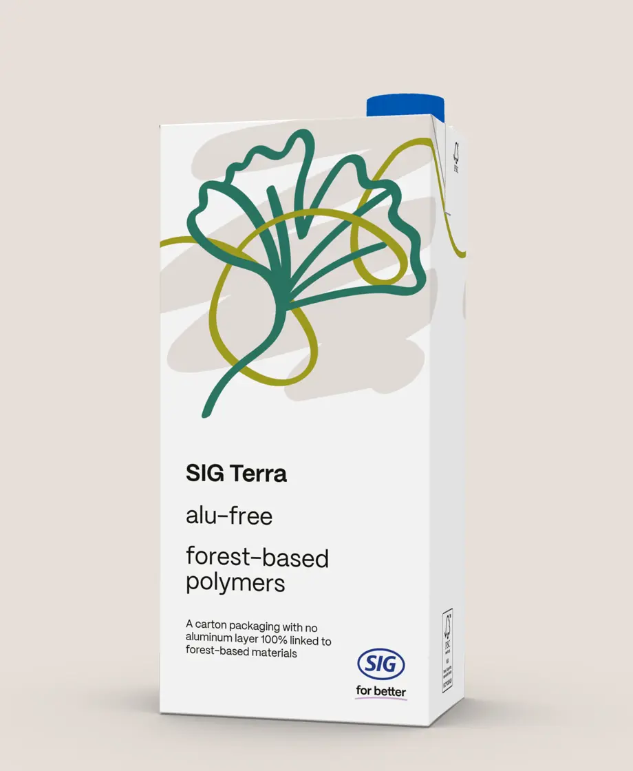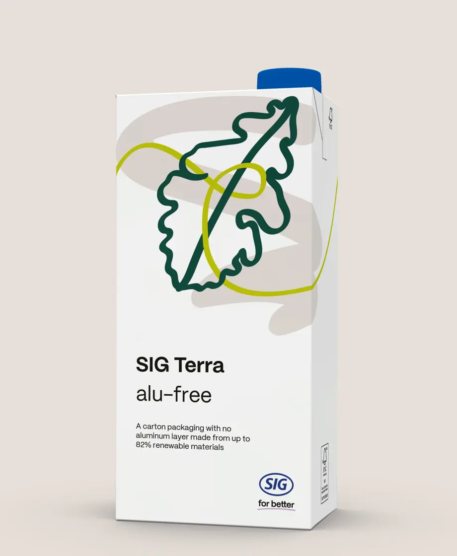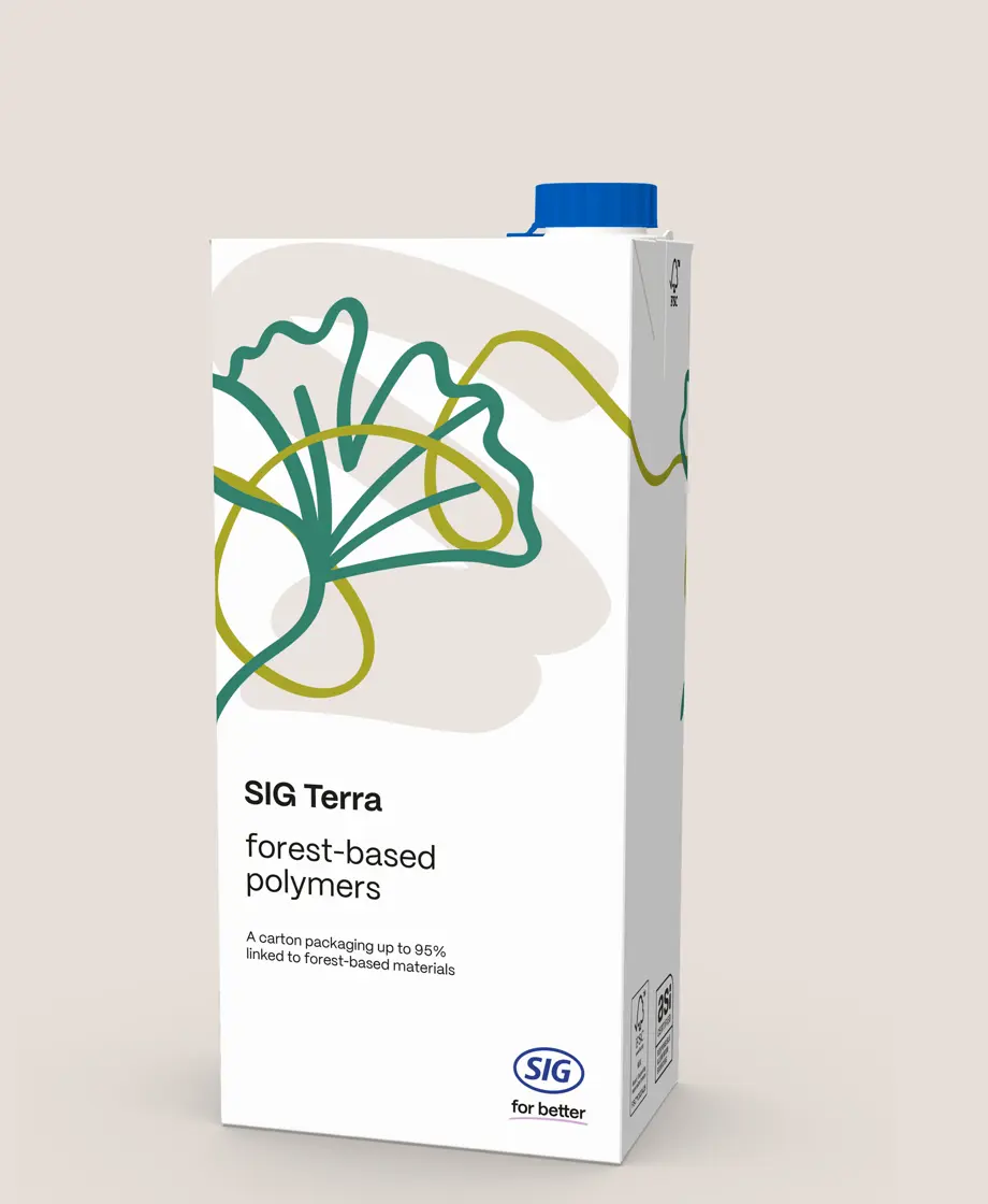 Nuestro portafolio SIG Terra ofrece soluciones con una huella de carbono entre un 27% y un 58% inferior a la de nuestros envases de cartón aséptico estándar.