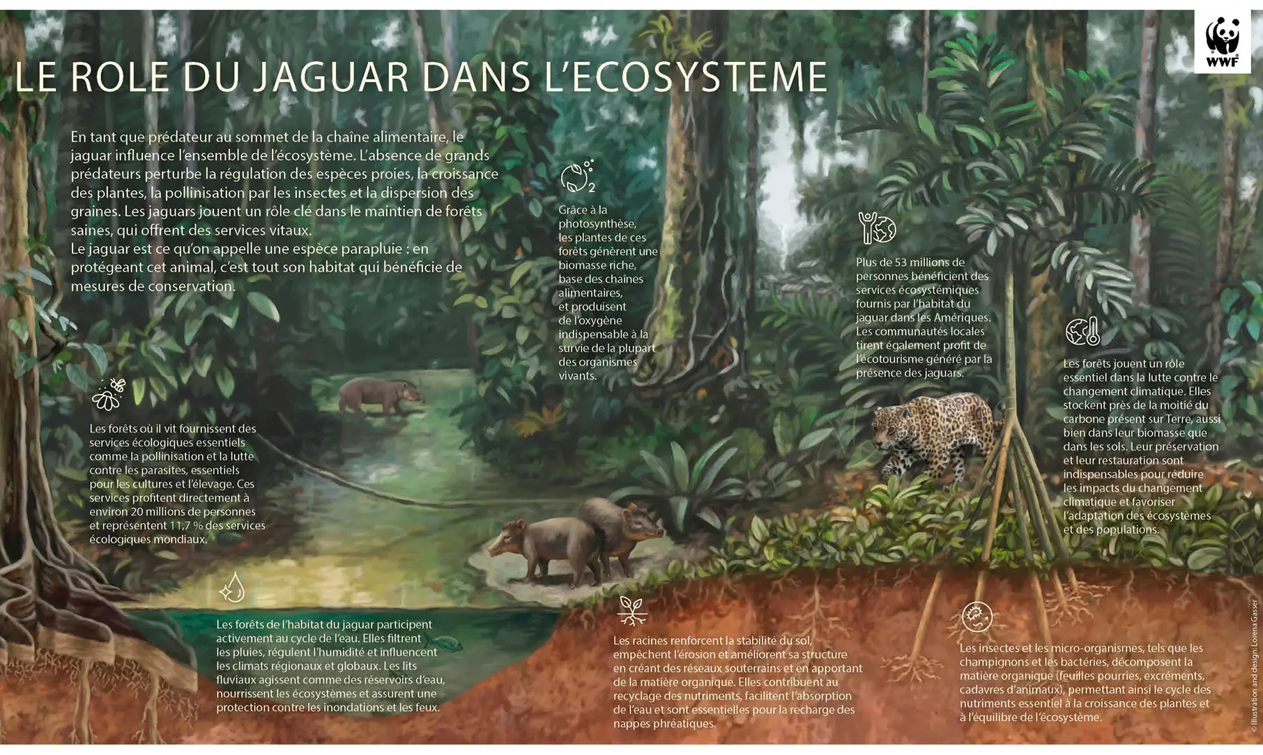Heureusement, lorsque les jaguars et leurs habitats sont préservés, c’est l’ensemble de la planète qui en profite. Les forêts où ils vivent offrent des services essentiels à plus de 53 millions de personnes : eau potable, captage du carbone, production d’oxygène, pollinisation, entre autres.