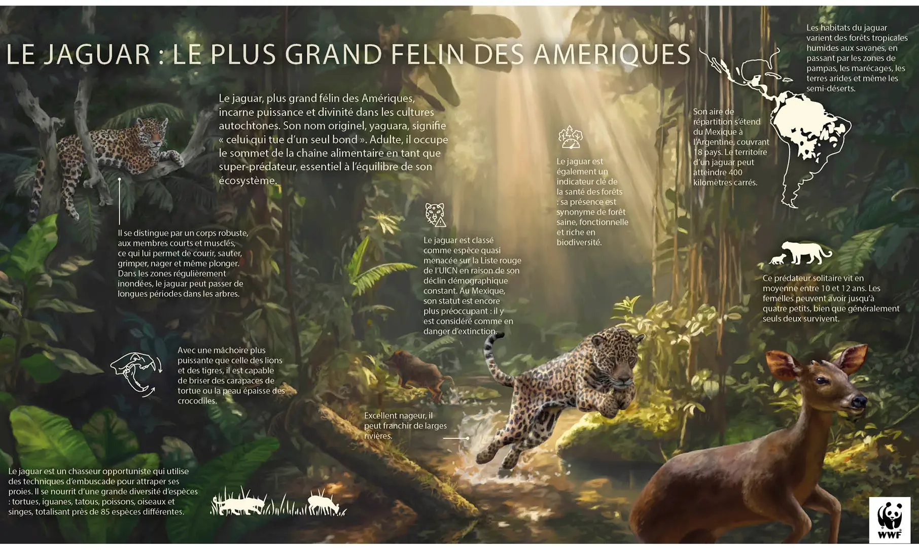 Le jaguar incarne parfaitement le concept d’espèce parapluie. Pour survivre, ce grand prédateur a besoin de vastes territoires, d’un habitat naturel préservé et d’une abondance de proies. Pour les défenseurs de l’environnement, dont le WWF, les efforts consacrés à la sauvegarde du jaguar contribuent également à protéger toutes les autres espèces du même écosystème, tout en profitant aux communautés locales. À l’image d’un parapluie qui protège ce qu’il recouvre, le jaguar joue un rôle central dans l’équilibre de son royaume forestier, assurant la survie de ceux qui en dépendent.