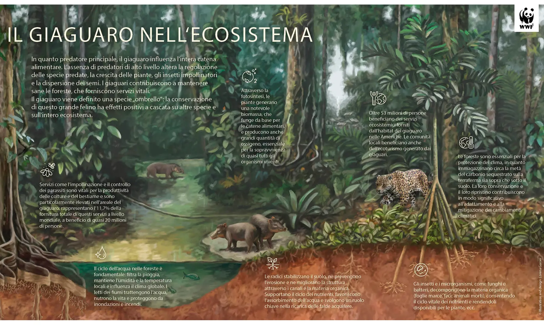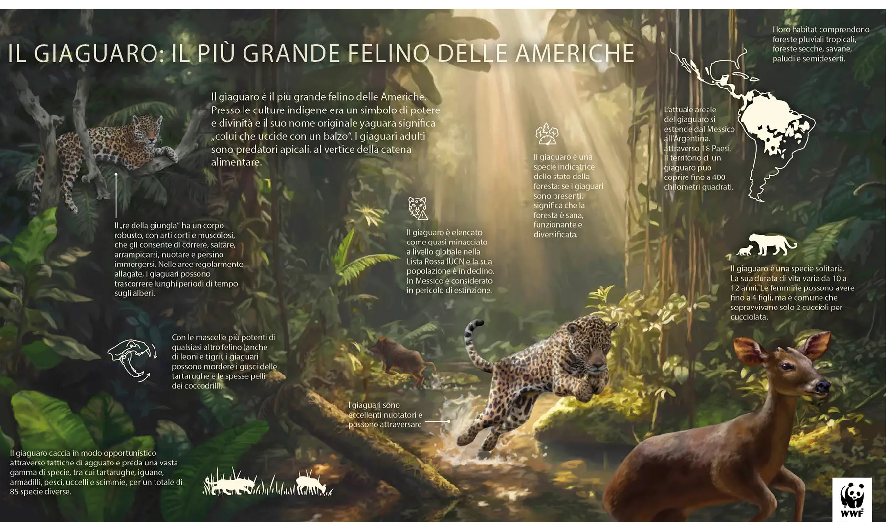 I requisiti del giaguaro di un ampio areale, di un habitat naturale sano e di un'abbondanza di prede ne fanno un fantastico esempio di "specie ombrello". Per gli ambientalisti, tra cui il WWF, ciò significa che la conservazione del giaguaro contribuisce a proteggere anche tutte le altre specie dello stesso ecosistema, con benefici anche per le comunità locali. Proprio come un ombrello protegge dalla pioggia tutto ciò che si trova sotto di esso, il giaguaro può proteggere il suo regno e tutti coloro che dipendono da esso.