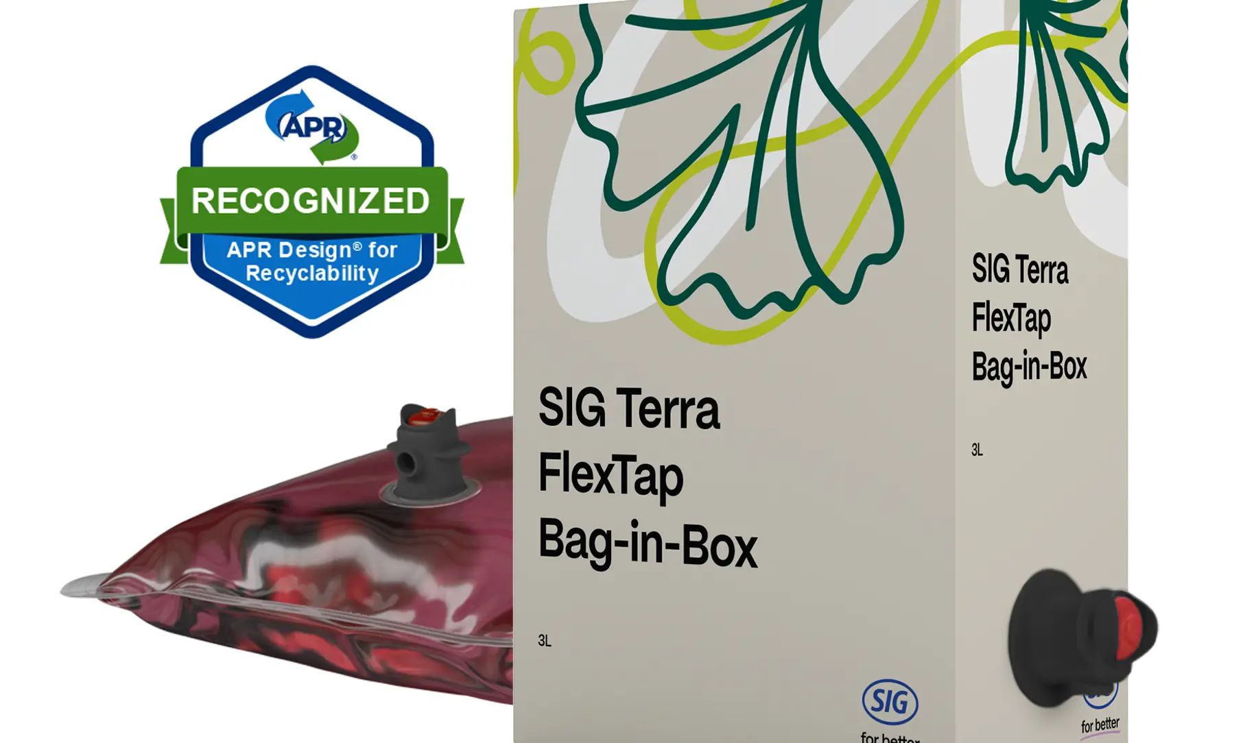 SIG ha ricevuto un riconoscimento formale dell'APR (Association of Plastic Recyclers) per aver soddisfatto i più alti criteri di riciclabilità secondo l'APR Design® Guide for Plastics Recyclability. Questo riconoscimento è stato attribuito alla confezione Bag-in-Box per il vino SIG Terra RecShield BD con erogatore SIG Terra FlexTap.