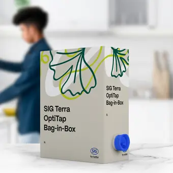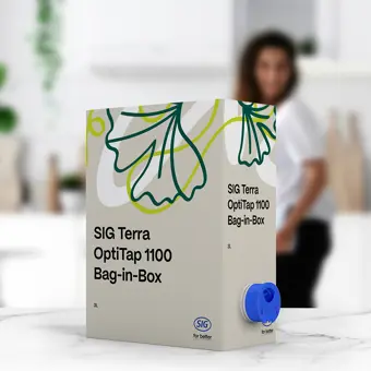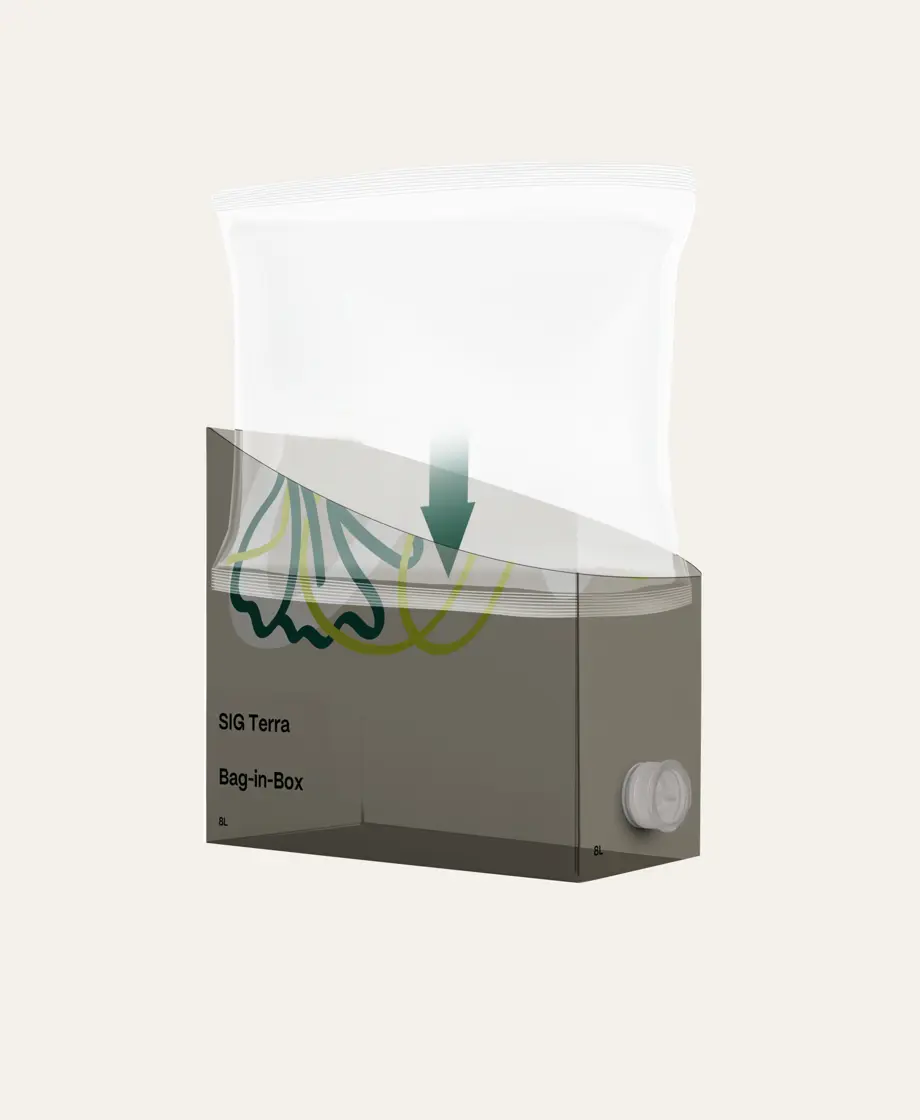 SIG Terra OptiTap 2300 unisce sostenibilità ed efficienza in una soluzione bag-in-box on-tap. Questa soluzione ha una struttura pronta per il riciclo e riduce l'uso complessivo di plastica rispetto alle alternative rigide come le bottiglie d'acqua in PET.